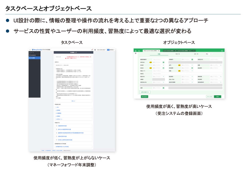 UI設計におけるオブジェクトベースとタスクベースのアプローチは、システムの利用頻度やユーザーの習熟度によって、最適な選択が異なります。