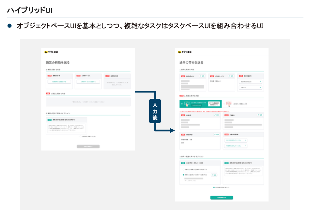 ユーザーが「荷物というオブジェクト」を選択・確認した上で、その荷物に対する「集荷依頼というタスク」を段階的に進める設計になっているため、オブジェクトベースとタスクベースの両方の要素を組み合わせたハイブリッドUIであると言えます。