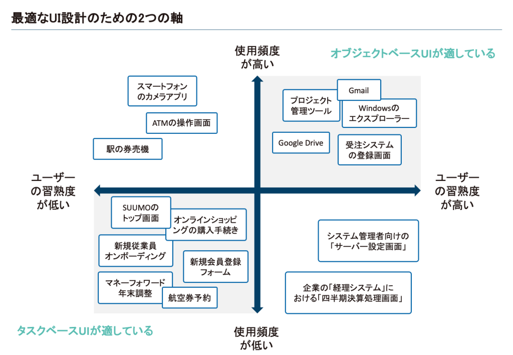 - 使用頻度が高く、ユーザーの習熟度も高い場合=オブジェクトベースが最適(右上の象限)